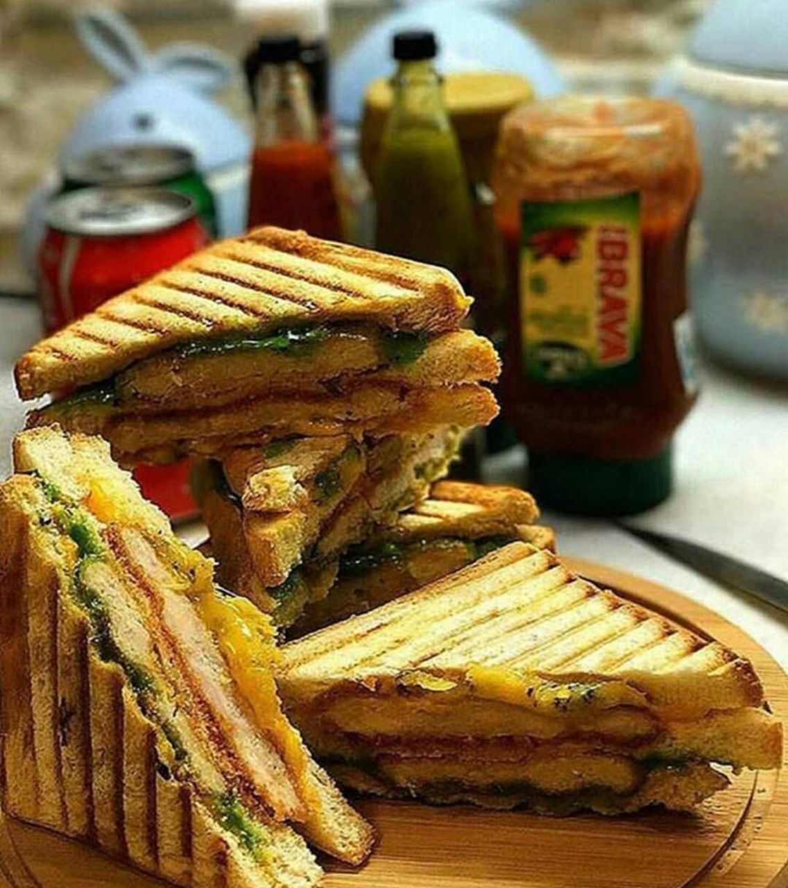نان چیاباتا تست شده + مرغ مزه دار +پنیر پیتزا + قارچ + فلفل دلمه ای