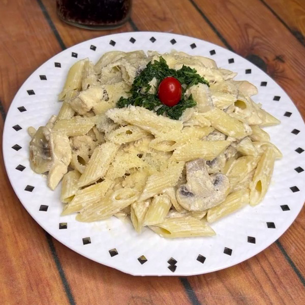 پنه + سس آلفردو + مرغ سوخاری+ پنیر پارمسان+قارچ