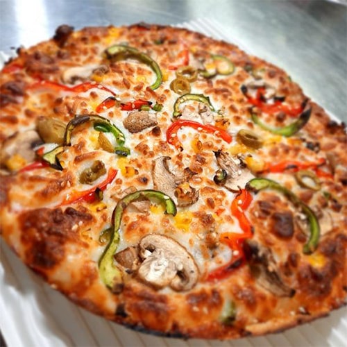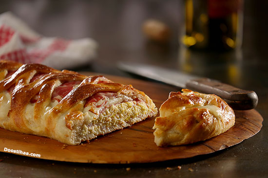 خمیر مخصوص +ژامبون+پنیر پیتزا + قارچ+ فلفل دلمه ای + کنجد